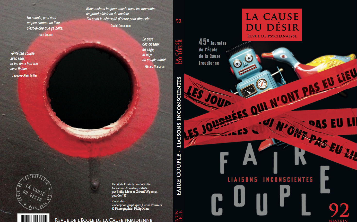 Cette fois il n’avait pas eu lieu. Le numéro portait la trace de l’explosion subjective que nous avons vécue. Fait de textes plus courts que d’habitude, il se présente plus éclaté, plus fragmentaire : un concert de voix, de positions singulières sur Faire couple. Seules les rubriques Cas et Restes, c’est-à-dire les deux parties les plus cliniques de chaque numéro de LCD, ont résisté à cette fragmentation.